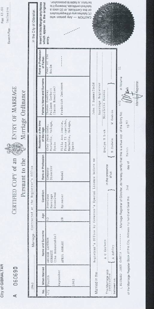 The marriage between April Ashley and Arthur Cameron Corbett, it seems, was not one of total mutual agreement between them. April Ashley up to that time had shown little interest in this man, but it seems that he wooed her with his title and money. We must note also that Arthur Cameron Corbett was the one who applied for a special marriage licence in Gibraltar, after which he discussed financial arrangements with her. What exactly were these financial arrangements, and what else did he promise her? We can only assume, if they were spoken of in the case they were deleted from the Law Report. But with the knowledge we have of the background of these two people a very clear picture emerges. Arthur Cameron Corbett was to be no other than Lord Rowallen and Heir to his Fathers estates (Baron Rowallen Peer of the Realm). His marriage to her would automatically make her Lady Rowallen, and give her financial rights. It seems that these were the financial arrangements and a wonderful prospect for her future. But April Ashley had to weigh the gains and the losses from such a union, and the realities, especially the social and legal implications. It seems from the evidence of the case that she was reluctant to go through with this marriage, and Arthur Cameron Corbett with his intense desire to have her as his wife and chattel, pressed her to go through with the marriage. In the end she decided to go through with it at the last moment.