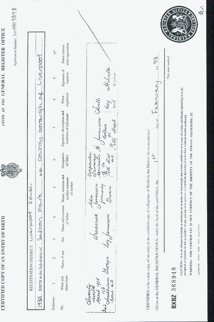 We now have another question concerning Birth Certificates amendments to these certificates, and the involvement of marriage. Of the three copies I have shown as evidence, it will be seen that one was amended in 1944 another in 1951. Those amendments were made before the 1955 Births and Deaths Act. The British Government have stated in the Rees and Cossey case "civil registration of births, deaths and marriages was statutorily established in England and Wales in 1837","improveraents made under the Consolidation of Enactment's (Procedure) Act 1949". The 1955 Act was just an act to consolidate Births, Deaths, and Marriages into one Act for England and Wales.