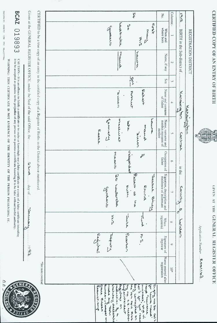 1.Laura Maud Dillon, sex girl, born 1915, amended in 1944. Amendment on the entry of birth reads. "In entry NO. 54 col. 2 for Laura Maud, read ‘Lawrence Michael’ and in col. 3 for girl read boy, corrected on the 14th April 1 944 by me C E Weston Superintendent Register on production of a statutory declaration made 'John Burdon Cooper and Grace Eileen Beauchamp. The Birth Certificate as shown in the register reads now. Lawrence Michael Dillon, sex ‘boy, date of birth First of May 1915.
