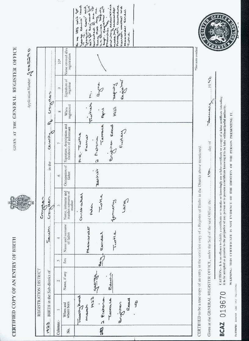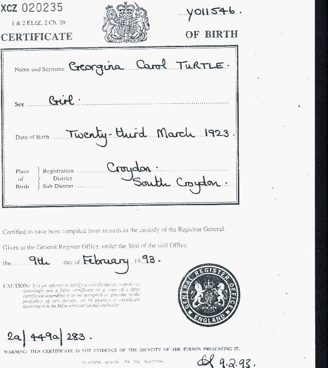 3. George Edwin Turtle, sex boy, born 1923. Amended in 1960. Amendment on the entry of birth reads. In NO 283 col. 2 for ‘George Edwin’ read ‘Georgina Carol’ and col.3 for ‘boy’ read ‘girl’ corrected on the 1st July 1960 by me J H Davies Deputy Supt Registrar on production of statutory declaration made by Alexander Fanagich Cawadire Kenneth Walter and Alexander Randel Turtle. The birth certificate as shown in the registers reads now Georgina Carol Turtle, sex 'girl' date of birth twenty third March 1923.