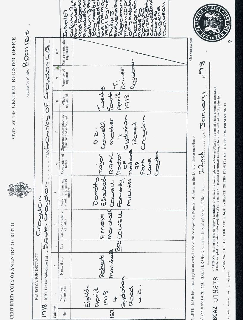 2. Robert Marshal Cowell, sex boy, born 1918, amended in 1951. Amendment on the entry of birth reads. "In NO 157 col. 2 for Robert 'Roberta' and column 3 for 'boy' read 'girl'. Corrected on the 17th May 1951 by me Philip.J.Stevens Supt Registrar on production of statutory declaration made by Dorothy Elizabeth Cowell and Charles Eugene Dusseau. The birth Certificate as shown in the Registers reads now, Roberta Elizabeth Cowell, sex girl, date of birth eighth April 1918.