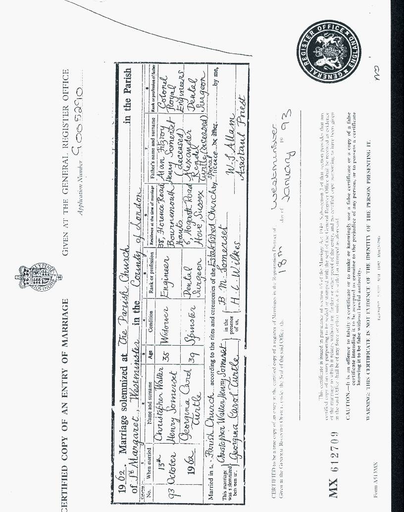 In addition to the changed birth certificate of,‘Georgina Carol Turtle’. I present a certified copy of her marriage certificate, which states that she was married on 13th October 1962 to Christopher Walter Henry Somerset.